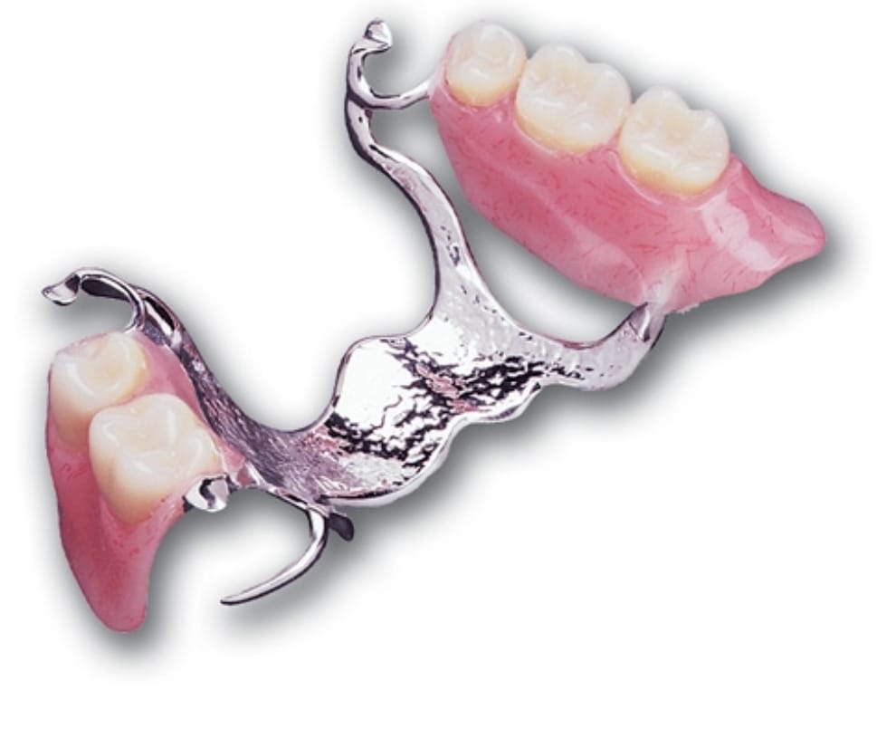 Une prothèse amovible partielle est constituée soit d’une base complètement en résine servant de support aux dents artificielles (Valplast), soit d’une armature métallique en chrome-cobalt (appelée châssis) garnie de résine acrylique supportant les dents de remplacement. La rétention de cette prothèse est assurée par des crochets qui s’insèrent sur des dents naturelles. Une prothèse à châssis métallique est pourvue d’appuis dentaires qui s’opposent à son enfoncement progressif dans la muqueuse sous-jacente, ce qui limite les risques d’inflammation gingivale autour des dents persistantes. Plus rigide et plus résistante, elle doit être préférée dans la majorité des cas.