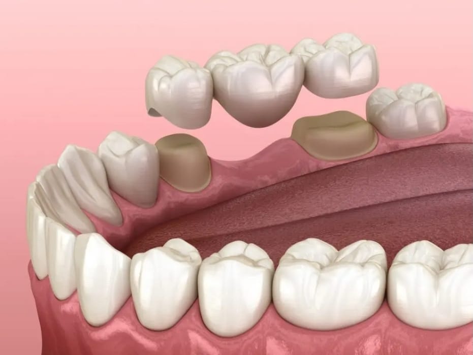 Bridge (pont) : Il permet de remplacer une ou plusieurs dents absentes en s’appuyant sur les dents adjacentes à l’édentement (les dents piliers). Un bridge prenant appui sur les deux dents adjacentes à la zone édentée permet de remplacer une ou deux dents absentes. Au-delà le risque de fracture est trop élevé. Mais on peut également réaliser un bridge de plus grande étendue en augmentant le nombre de dents piliers. La préparation des dents piliers est identique à celle des dents recevant une couronne. Tout comme les couronnes, les bridges peuvent être scellés ou collés aux dents piliers. Si une dent pilier est intacte, nous nous refusons de la préparer pour une prothèse fixée. Nous privilégierons une solution implantaire qui aura l’avantage de ne pas impliquer les dents adjacentes à l’espace édenté ; et ainsi, par conséquent, les dents resteront parfaitement intactes.