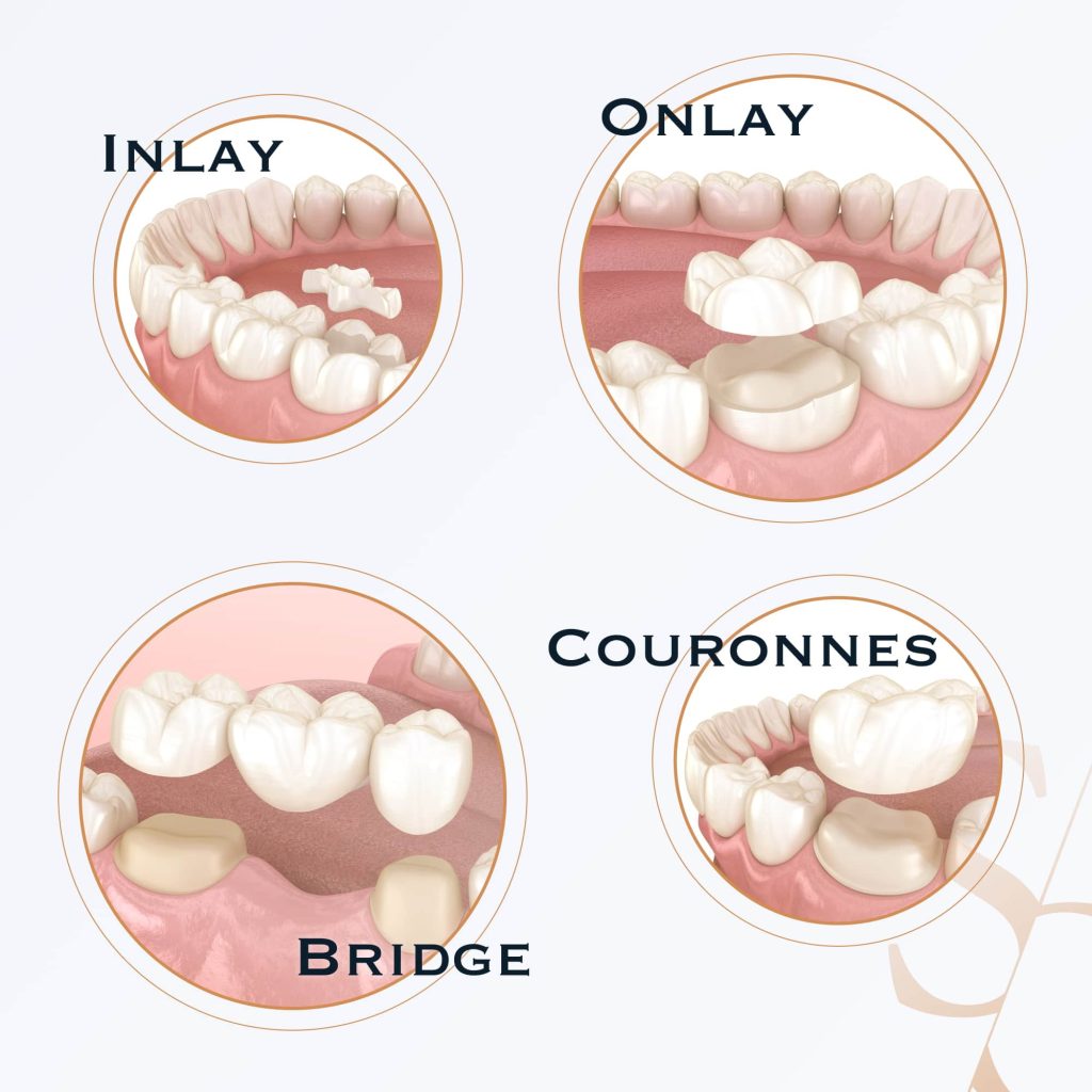 Inlay/Onlay: En céramique ou en zircone ils offrent une solution esthétique et durable pour restaurer une dent endommagé. Ces solutions permettent de préserver une grande partie de la structure dentaire naturelle, tout en offrant une résistance accrue et une apparence naturelle